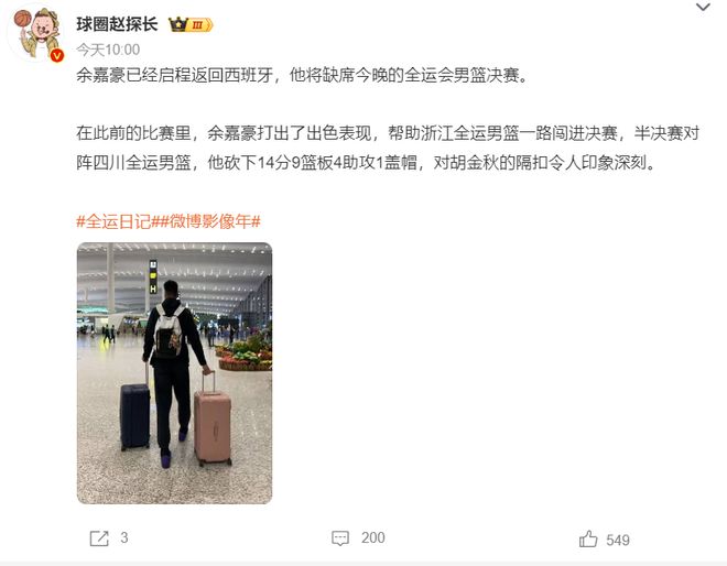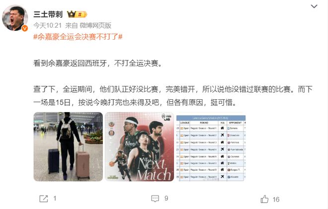 媒体人三土带刺也表示:查了一下全运会期间埃斯特拉男篮并没有比赛,完美错开,所以他没有错过任何一场西乙比赛,下一场是15号,按理说打完决赛走也来得及。
