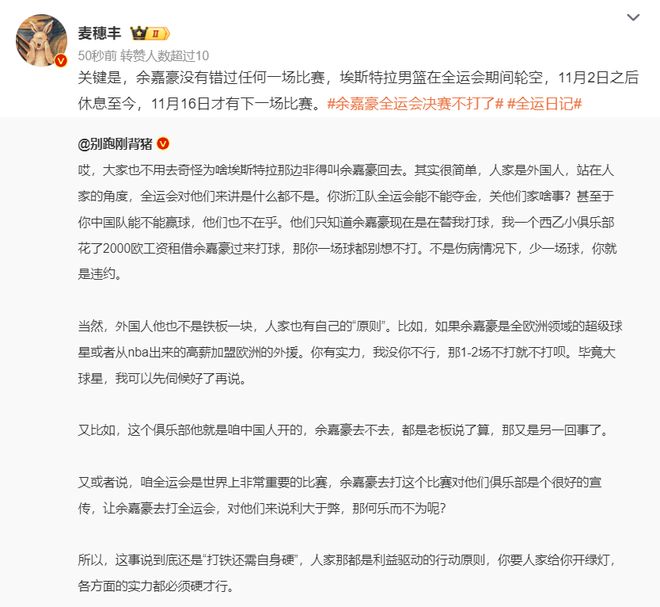 浙江男篮VS广东男篮的全运会决赛即将开打,但在这场决赛之前,余嘉豪已经登上了返回西班牙的航班,他在半决赛拿到14+9帮助浙江爆冷击败四川队后就已经连夜返回西乙,这引发了巨大的争议。