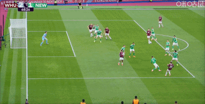 第45+5分钟,博特曼倒地解围自摆乌龙,西汉姆2-1纽卡