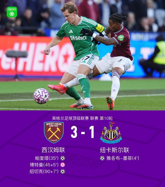北京时间11月2日,英超联赛第10轮展开角逐,西汉姆联坐镇主场迎战纽卡斯尔联。吉马良斯助攻雅各布-墨菲闪击破门。帕奎塔一记世界波将比分扳平。上半场临近结束前,博特曼不慎自摆乌龙,西汉姆联借此反超比分。下半场,波茨进球越位在先,绍切克补射破门为西汉姆联锁定胜局。最终,西汉姆联3-1逆转战胜纽卡斯尔联。